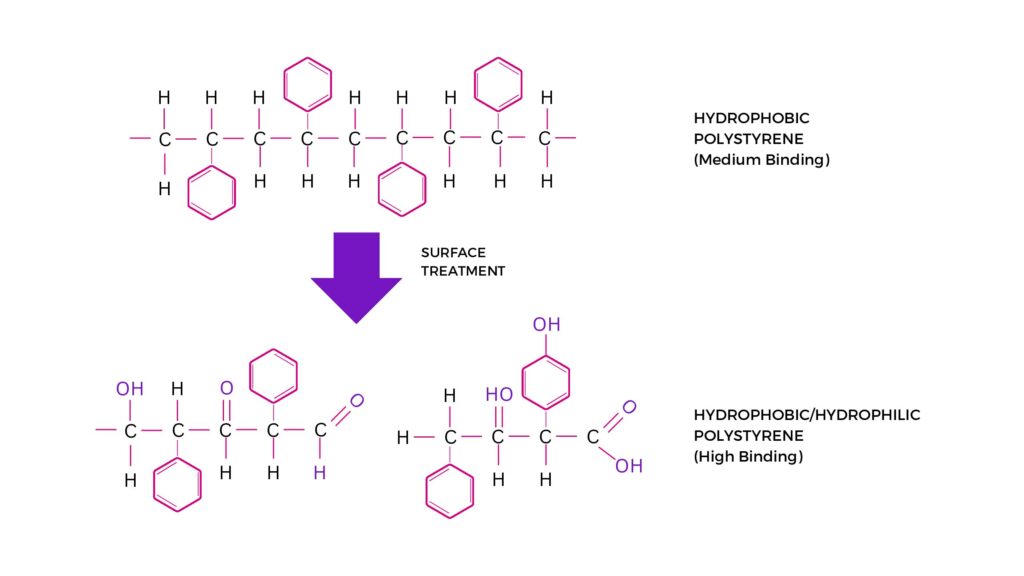 Polystyrene is composed of an aliphatic carbon chain with pendant intermittent benzene rings. This provides a very hydrophobic surface and plates of this type are typically referred to as “medium binding”. Thanks to a surface treatment, such as irradiation, it is possible to enhance the polystyrene plates surface binding capacity. These kind of surface treatments break a certain number of benzene rings, yielding carboxyl (COOH) and hydroxyl (OH) groups. The presence of these molecular groups provides an opportunity for hydrophilic interactions. Well plates with such characteristics are referred as “high binding”. The resulting surface is primarily hydrophobic with intermittent carboxylic and hydroxylic groups capable of ionic interactions with positively charged groups on biomolecules.